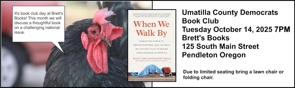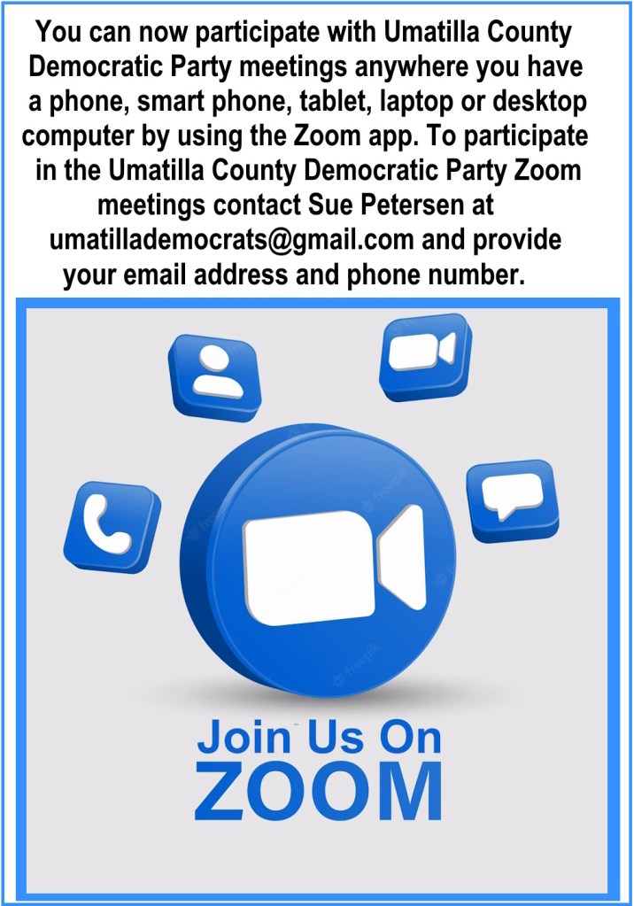 We meet on the second Monday of every month via Zoom; please email us for details. You can send donations with the check made out to Umatilla County Democratic Party then mail it to Umatilla Democratic Party, P.O. Box 284, Pendleton OR 97801. Donations can also be made to the local party at ActBlue.com.