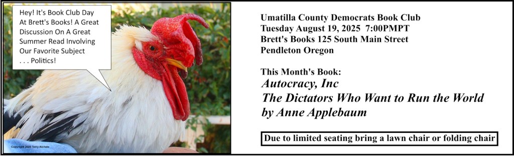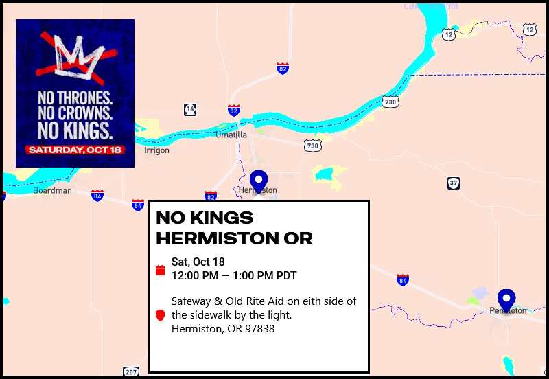 A compilation of photos highlighting the gathering of progressive people & others who came together in Hermiston, Oregon to declare that they do not want donald trump to be a king or a dictator. Americans have been against fascism to 250 years & around 150 people gathered on Saturday to make that declaration in public. The gathering had folks ranging in age from grade schoolers to a 94 year old grandmother. Some of the folks wore costumes including the ever popular frog costume. A couple people provided music on each side of the street adding to the festive atmosphere. It was a chance for folks to meet people with similar interests & exchange their experiences. There were people from Hermiston, Umatilla & Irrigon. Some wanted to find out how they could get involved to create a positive & strong Second Congressional District in the coming year.Hermiston, Oregon took part in the No Kings movement on Saturday, October 18, 2025. It’s estimated that around 150 people took part in the public display against the actions of Donald Trump. There were people of all ages from grade schoolers to a 94 year grandmother. A number of rally goers showed up in costume adding to the positive fun vibe.This map is based on nokings.org for the Pendleton Oregon No Kings gathering on Saturday October 18, 2025This map is based on nokings.org for the Hermiston, Oregon No Kings gathering on Saturday October 18, 2025MAGAt representative cliff bentz hasn’t done anything for Oregon’s 2nd Congressional District during the shut down. This chart from the New York Times shows that. Most cuts target Democratic districts but this cut to Oregon is over a third of the $750M of cuts in republican districts across the nation.Umatilla County Democrats Book Club is Tuesday October 14, 2025!Make your voice heard on Saturday October 18, 2025.Here is a list of Daily Democratic & Progressive Podcasters & Streamers on YouTube. I’m still working on the list but these are free to view with no membership required. In some cases like Don Lemon there may be several shows a day. Type these in the YouTube search bar to access.Here is a list of Weekly Democratic & Progressive Podcasters & Streamers on YouTube. I’m still working on the list but these are free to view with no membership required. The weekly programs are often specialized like Shrinking Trump analyzes trump’s psychopathy & sociopathy. Others look at the legal issues surrounding trump’s actions. Type these in the YouTube search bar to access.America is going downhill under donald trump.Umatilla County Democrats Book Club at Brett’s Books in Pendleton Tuesday August 19, 2025 7PM. Bring a folding chair.No Kings Saturday – June 14, 2025