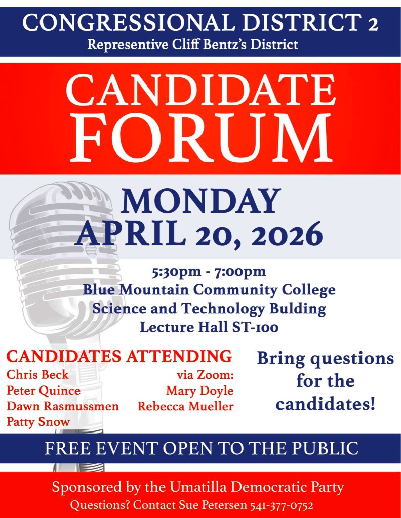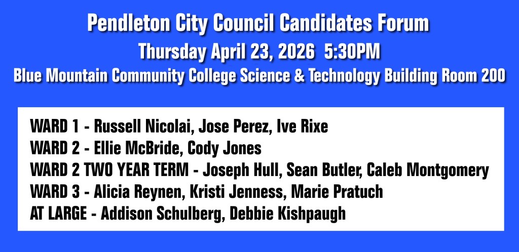 Pendleton City Council Candidates Forum Thursday April 23, 2026 5:30PM BMCC Science & Technology Building Room 200.